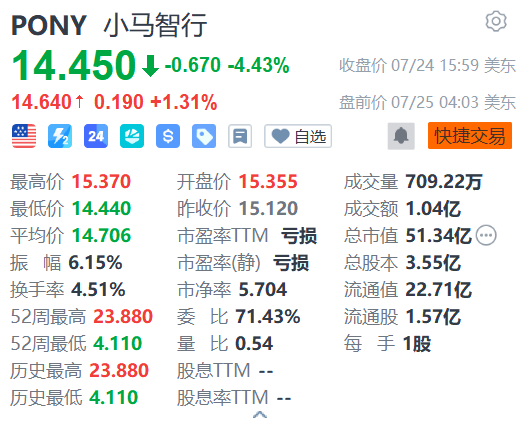 格隆汇7月25日|小马智行(PONY.US)盘前涨1.31%,报14.64美元。消息面上,小马智行今日宣布已在北京、广州、深圳三城开启7×24小时全天候自动驾驶测试,测试时段从原本早7点至晚23点扩充至全天24小时。全天候开放测试是北京、广州、深圳在自动驾驶政策上的重要创新和突破。随着7×24小时测试开启,小马智行将探索自动驾驶出行在夜间时段的实用场景,改善深夜出行难的问题。(格隆汇)