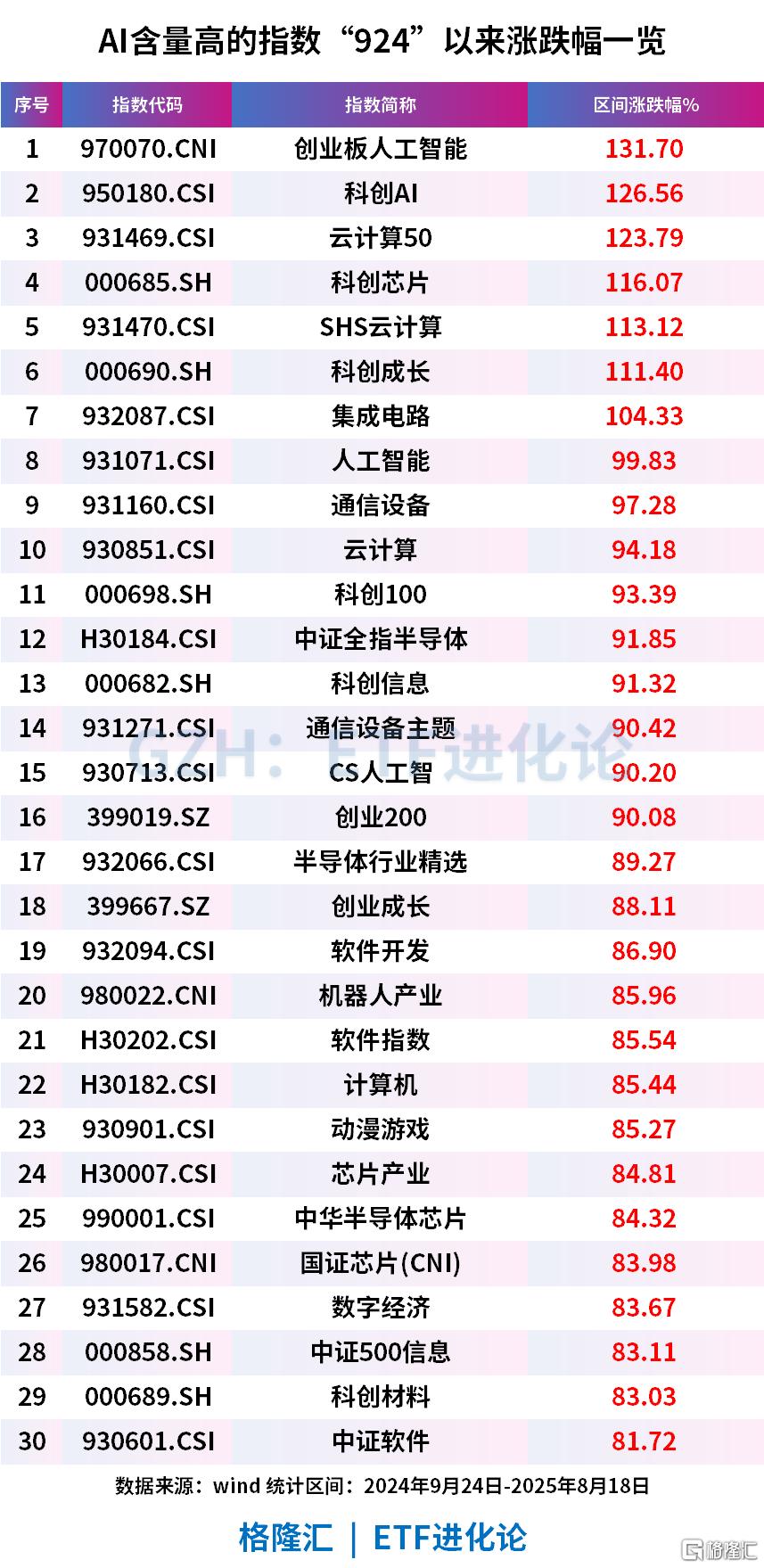 自“924”以来,截至8月18日,与AI算力紧密相关指数强势霸榜,其中创业板人工智能指数以131.7%的涨幅,领涨全市场“AI含量高”指数,科创AI指数以126.56%的涨幅紧随其后。