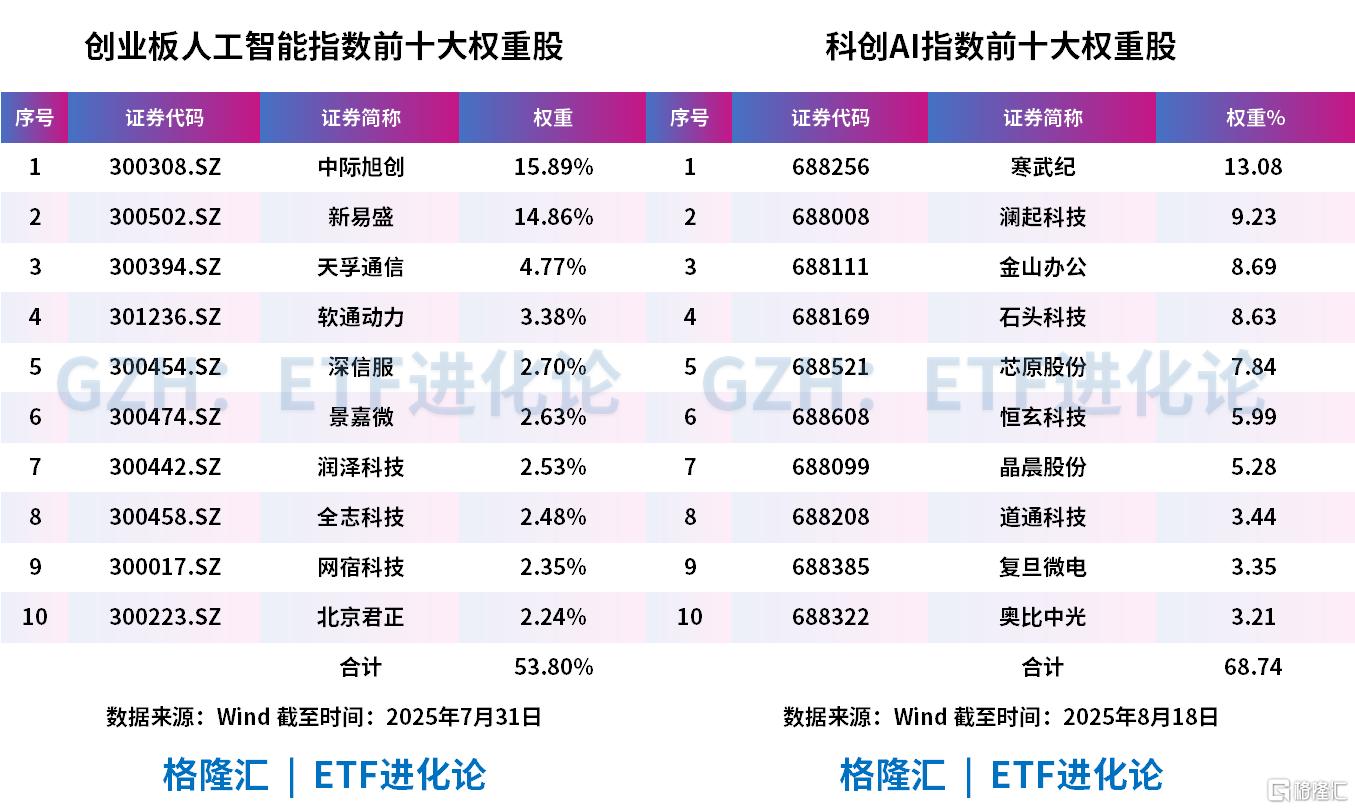 从指数编制方式来看,创业板人工智能指数从创业板中选取样本,是在业务涉及存算和网络设备、数据和软件服务、场景应用等人工智能相关领域的股票里,选最近半年日均总市值排名前50名的股票。科创AI指数则仅从科创板中选取,是挑选30只市值较大且业务涉及为人工智能提供基础资源、技术以及应用支持的上市公司证券。