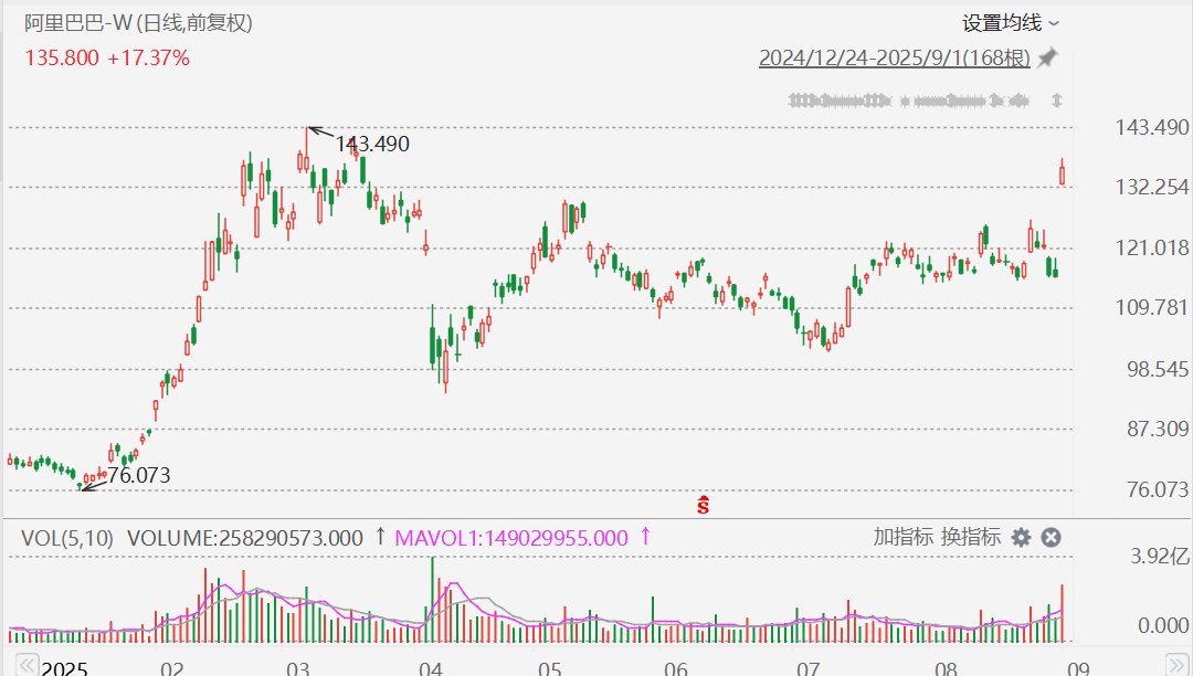 格隆汇9月1日|阿里巴巴(9988.HK)盘中一度涨近19%,报137.5港元,有望创下自2022年3月以来最大单日涨幅。