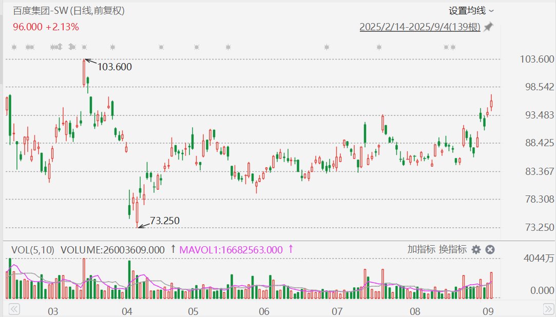 格隆汇9月4日|百度集团-SW(9888.HK)今日收涨2.13%,报96港元,盘中一度涨至97.1港元,创近6个月新高。消息面上,纳斯达克分析师上调百度目标价至133美金,花旗等机构给予百度最高目标价达145.84美金。高盛最新研报表示,百度在全球无人驾驶商业化领域处于领先地位,给予买入评级。
