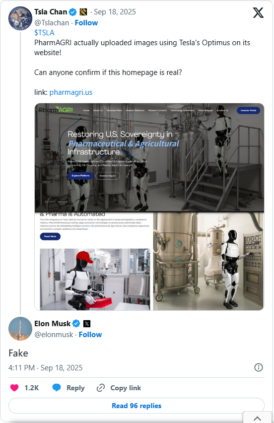 格隆汇9月19日|针对近期有消息称美国植物基制药企业PharmAGRI与特斯拉签署意向书,计划在自营农场和处方药生产环节部署多达1万台Optimus Gen3+人形机器人一事,马斯克今日在社交媒体上简要回复称:假的。