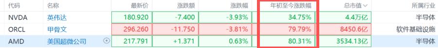 今年以来,AMD股价目前已上涨80%,甲骨文也涨超79%,而英伟达的涨幅仅约35%