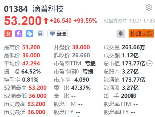 格隆汇10月27日|滴普科技(1384.HK)明日挂牌上市,成港股“企业级大模型AI应用第一股”。滴普科技在目前的暗盘交易中股价大涨。富途行情显示,滴普科技暗盘一度涨99.73%,报53.25港元。