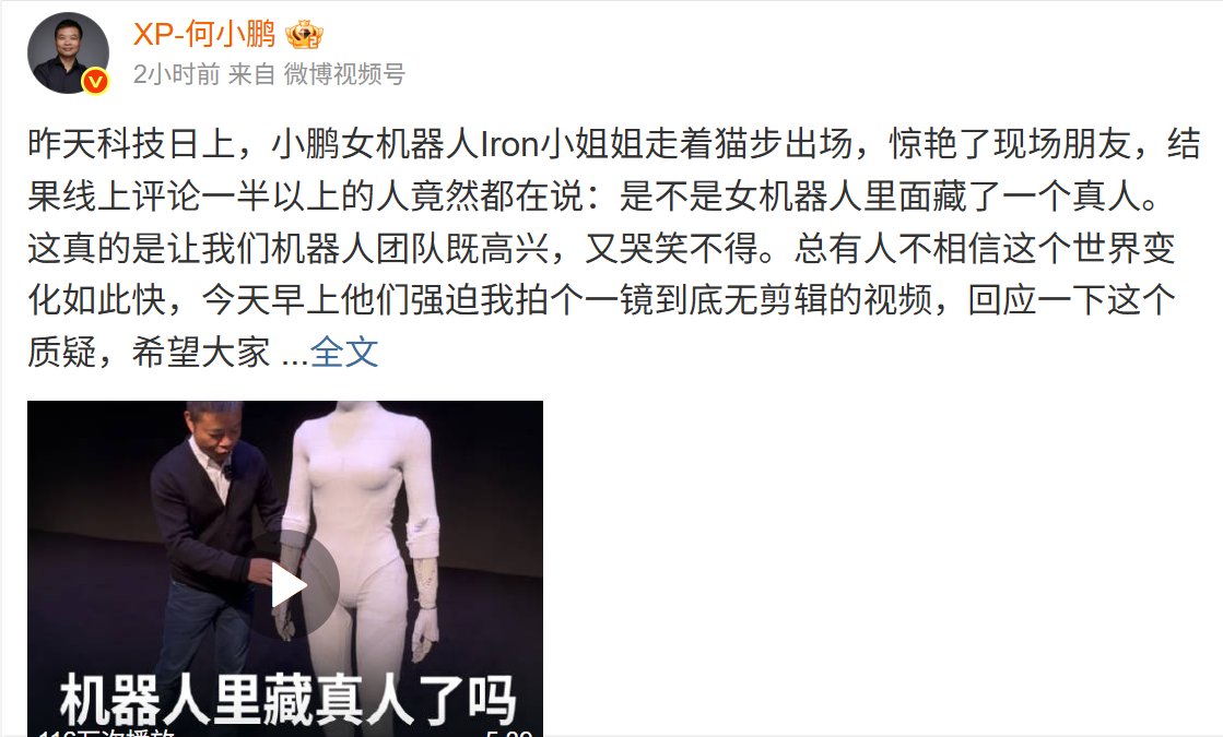 今日,何小鹏针对该质疑在其个人微博发文表示,昨天科技日上,小鹏女机器人Iron小姐姐走着猫步出场,惊艳了现场朋友,结果线上评论一半以上的人竟然都在说:是不是女机器人里面藏了一个真人。