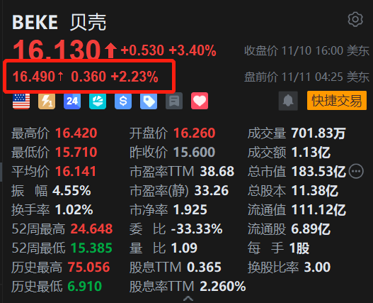 昨日上涨3.4%的贝壳(BEKE.US)盘前继续涨超2%。消息上,花旗发表报告指,贝壳第三季业绩胜预期,相信公司正步入正轨,明年净利润率料改善至7%,受多个因素驱动,包括代理及门店成本按年减少近20亿元下,继续把握市场份额。