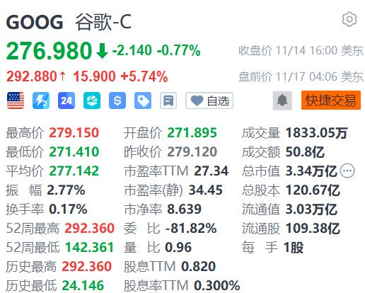 格隆汇11月17日|谷歌-C(GOOG.US)盘前大涨近6%,报292.88美元。消息面上,13F报告显示,巴菲特旗下伯克希尔三季度新买进1785万股谷歌A,持仓市值约为43.4亿美元,在整体持仓中占比为1.62%,新进成为伯克希尔第十大重仓股。这是伯克希尔首次建仓谷歌母公司。