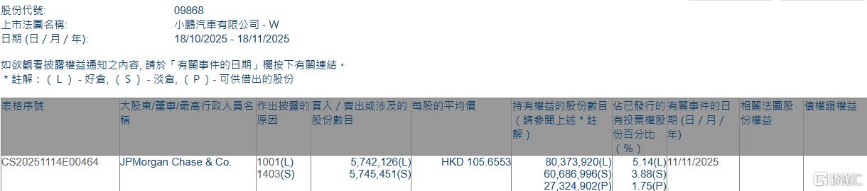 格隆汇11月18日丨根据联交所最新权益披露资料显示,2025年11月11日,小鹏汽车-W(09868.HK)获JPMorgan Chase & Co.以每股均价105.6553港元增持好仓574.21万股,涉资约6.07亿港元。