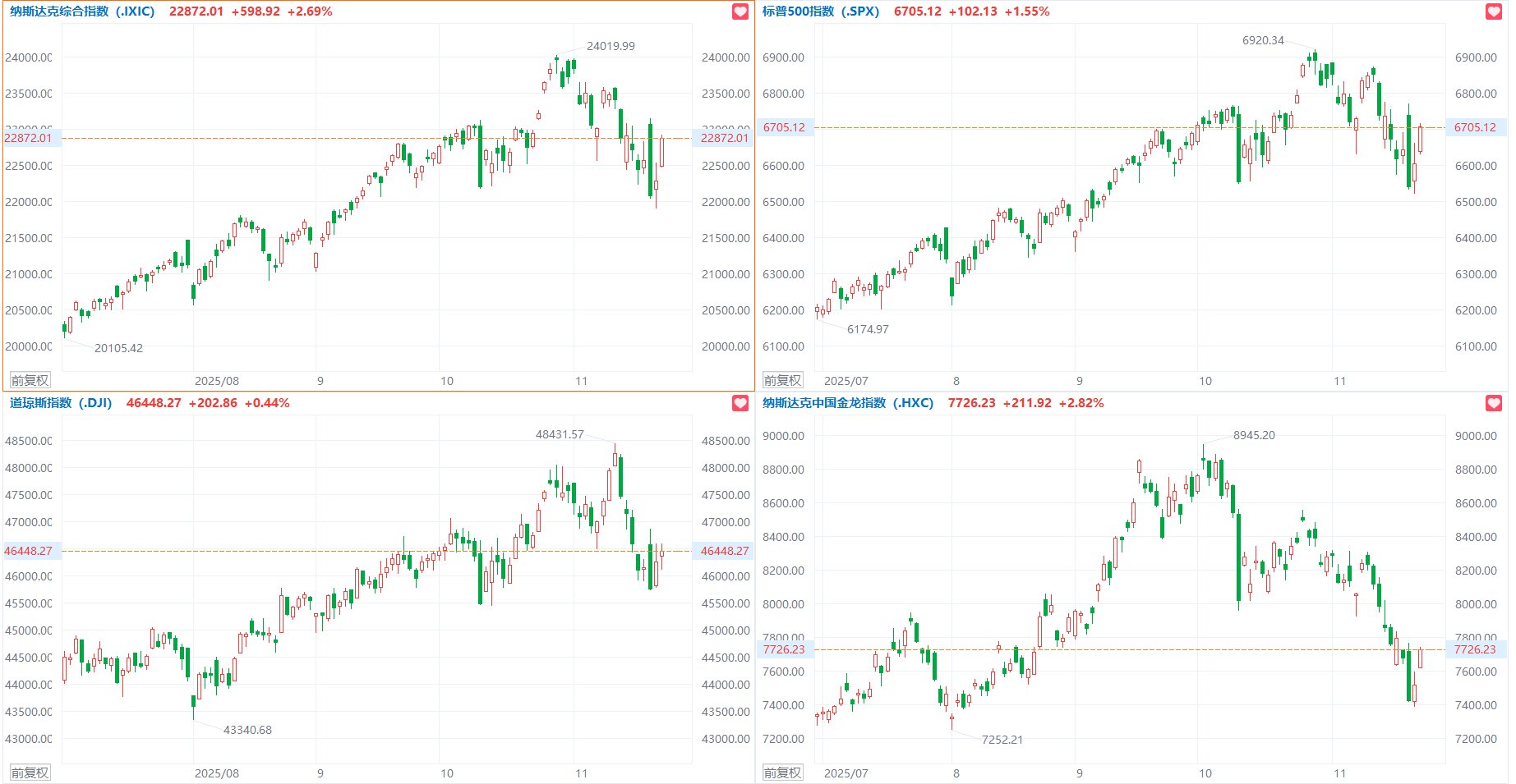 格隆汇11月25日|美股三大指数集体收涨,道琼斯指数涨0.44%,标普500指数涨1.55%,纳斯达克综合指数涨2.69%。大型科技股集体上涨,特斯拉、谷歌涨超6%。芯片股走强,博通股价上涨11%,创4月份以来最大涨幅,市值增加1780亿美元;费城半导体指数涨4.6%,美光科技涨近8%,AMD涨超5%,英伟达涨超2%。