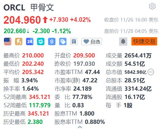 格隆汇11月28日|甲骨文(ORCL.US)盘前跌1.12%报202.66美元。消息面上,OpenAI的数据中心合作伙伴正在累积近1000亿美元与这家亏损的初创公司相关的借款。根据英国金融时报的分析,软银、甲骨文和CoreWeave等公司已借贷至少300亿美元用于投资这家初创公司或帮助建设其数据中心。知情人士透露,一个银行集团正在洽谈再提供380亿美元的贷款给甲骨文和数据中心建设商Vantage,用于为OpenAI建设更多的站点。预计该交易将在未来几周内敲定。