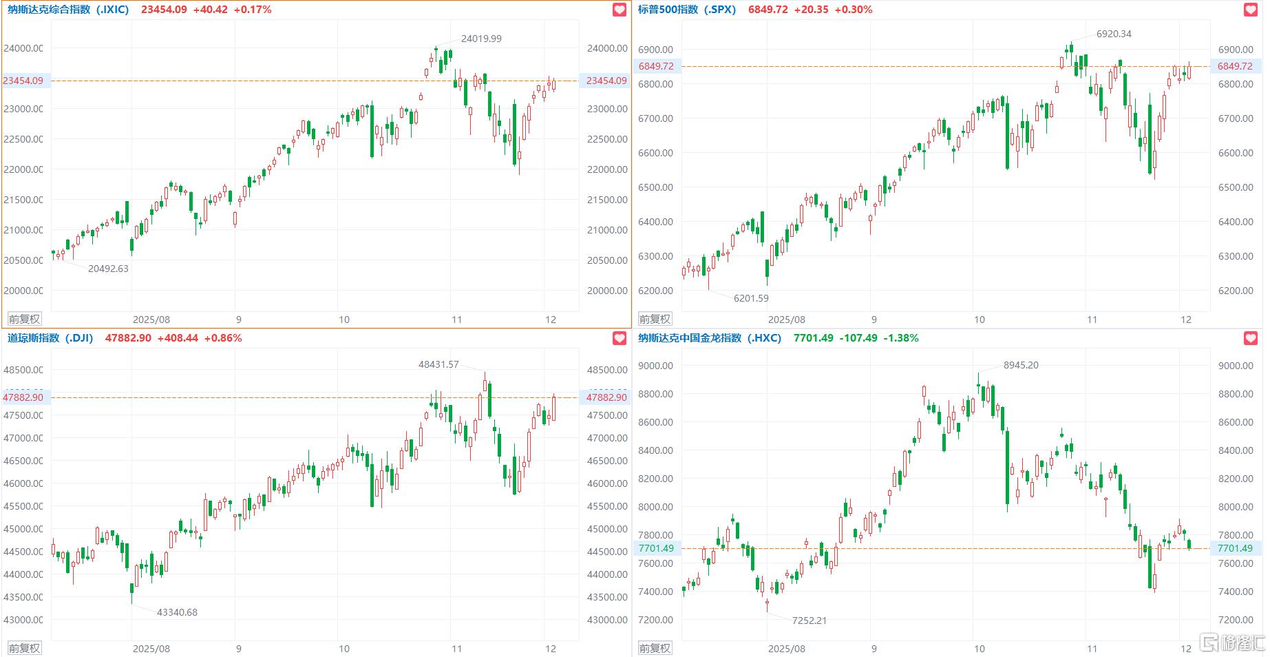 有色金属、加密储备概念股涨幅居前,美国铝业公司涨超6%,Coinbase、凯撒铝业涨超5%,Strategy涨超3%。存储概念股、锂矿股走低,SanDisk跌超5%,Lithium、美光科技、西部数据跌超2%。
