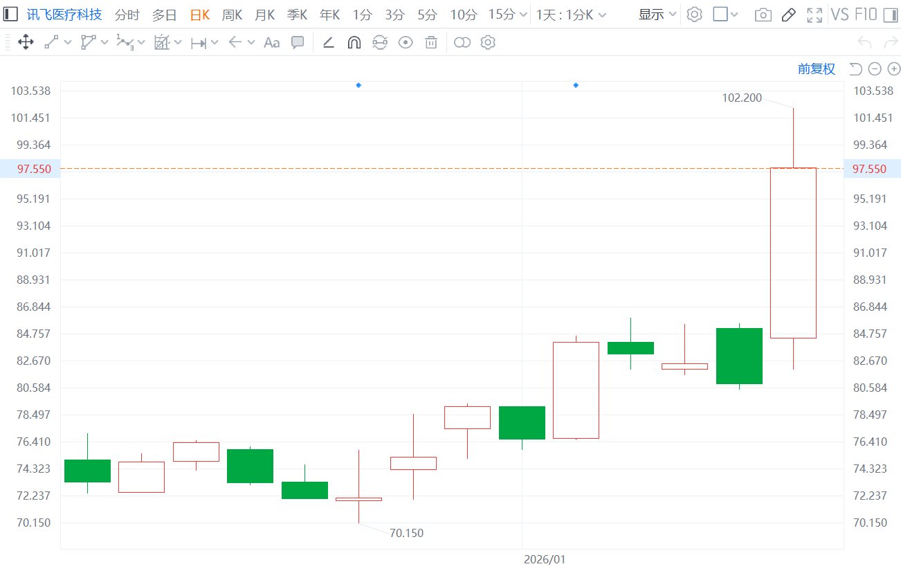 讯飞医疗科技(2506.HK)今日午后继续上扬,尾盘再度强势拉升,一度大涨26.33%至102.2港元,股价创约3个月新高。该股自去年12月29日以来持续反弹,迄今9个交易日的区间最大涨幅超45%,远远跑赢大盘表现(同期恒指区间最大涨幅为2.61%)。