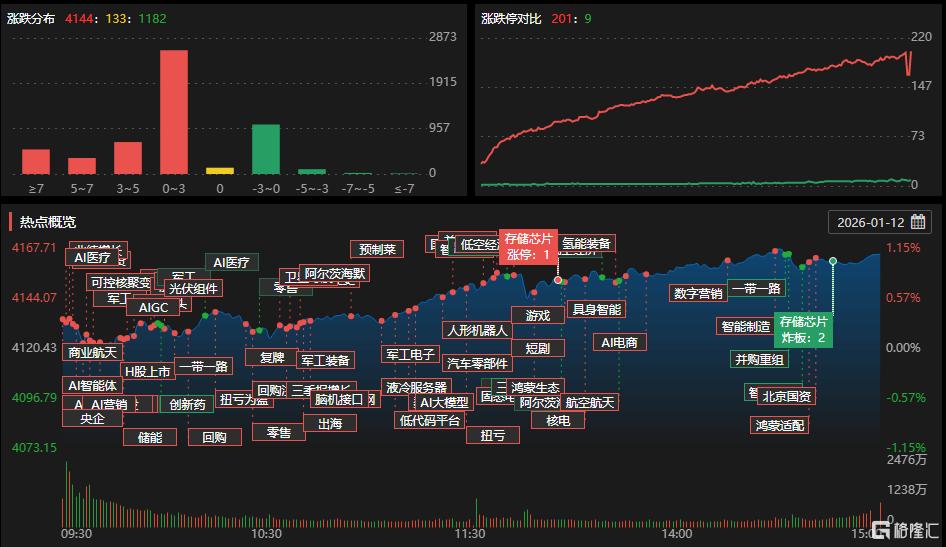 1月12日,A股主要指数继续上涨,沪指录得17连阳;沪指涨1.09%报4165点,深证成指涨1.75%,创业板指涨1.82%。沪深两市成交额3.6万亿,连续第2个交易日突破3万亿,超4100股上涨。