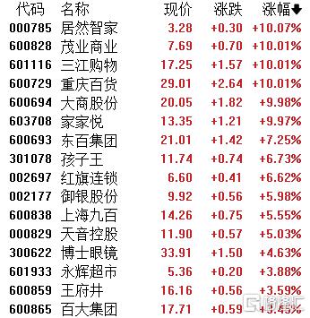 零售概念快速走高,居然智家、茂业商业、三江购物、重庆百货等涨停,东百集团、孩子王、红旗连锁、御银股份等跟涨。