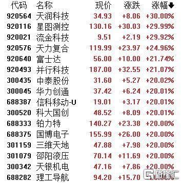 商业航天概念反复活跃,天润科技、星图测控、流金科技30CM涨停,天力复合、富士达、并行科技、中泰股份、华力创通、信科移动、科大国创等纷纷大涨。