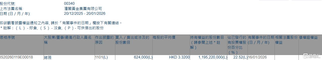 格隆汇1月20日丨根据联交所最新权益披露资料显示,2025年1月16日,潼关黄金(00340.HK)获股东蒋薇在场内以每股均价3.32港元增持62.4万股,涉资约207.2万港元。