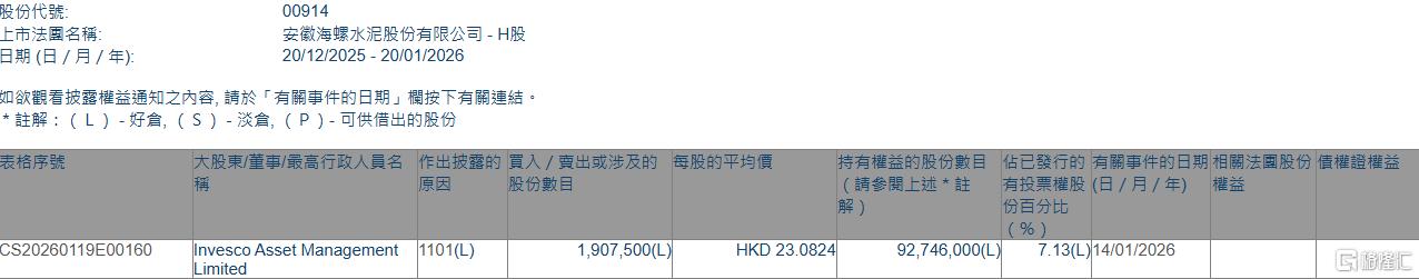 格隆汇1月20日丨根据联交所最新权益披露资料显示,2026年1月14日,海螺水泥(00914.HK)获Invesco Asset Management Limited在场内以每股均价23.0824港元增持190.75万股,涉资约4403万港元。