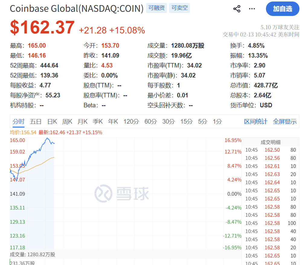 今夜,Coinbase股价反弹15%至162美元左右。该股周四曾下跌约8%,且在过去一年中累计跌幅约达50%。