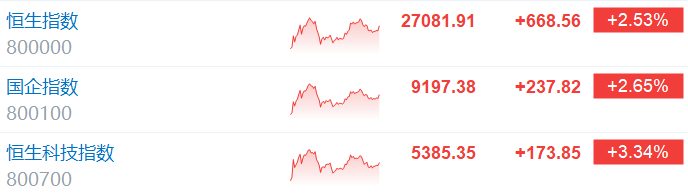格隆汇2月23日|港股今日情绪回暖,三大指数高开高走集体大涨。截至收盘,恒指涨2.53%,国指涨2.65%,恒生科技指数涨3.34%。