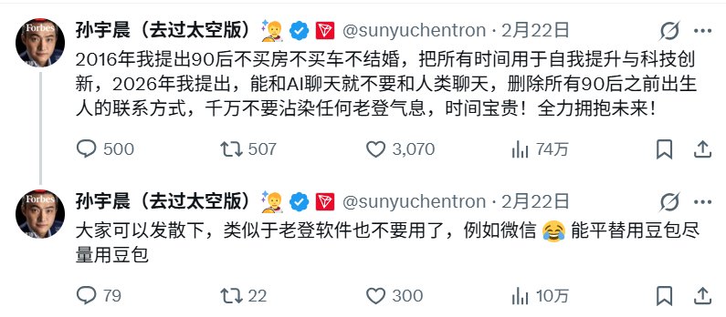 格隆汇2月23日|币圈大佬孙宇晨近日又出炸裂言论!孙宇晨2月22日在X上发文称:2016年我提出90后不买房不买车不结婚,把所有时间用于自我提升与科技创新,2026年我提出,能和AI聊天就不要和人类聊天,删除所有90后之前出生人的联系方式,千万不要沾染任何老登气息,时间宝贵!全力拥抱未来!孙宇晨还补充称:大家可以发散下,类似于老登软件也不要用了,例如微信,能平替用豆包尽量用豆包。