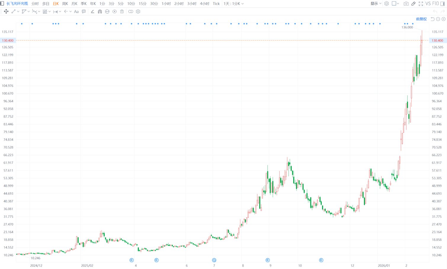 消息面上,在AI需求推动下,市场对光纤的需求高涨。根据CRU数据,2026年1月,国内G.652.D裸光纤现货价格环比上涨79%,同比上涨92%,自2025年5月以来累计涨幅超100%。华泰证券发表研报称,2026年1月,中国市场G.652.D单模光纤价格创下近七年新高,平均价格来到35元/芯公里。