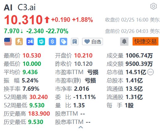 财报显示,在截至2026年1月31日的第三财季,C3.ai营收同比下降46%至5330万美元,较分析师普遍预期的7591万美元低30%;订阅收入总计4820万美元,占总营收的90%。调整后每股收益为-0.40美元,不及分析师普遍预期的-0.29美元。此外,C3.ai预计第四季度营收在4800万至5200万美元之间,大幅低于市场预期的7747万美元。