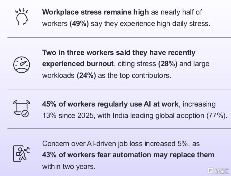 Manpower Group最新发布的《2026全球人才晴雨表》显示,过去一年里,定期使用AI的打工人比例飙升了13个百分点,达到45%。