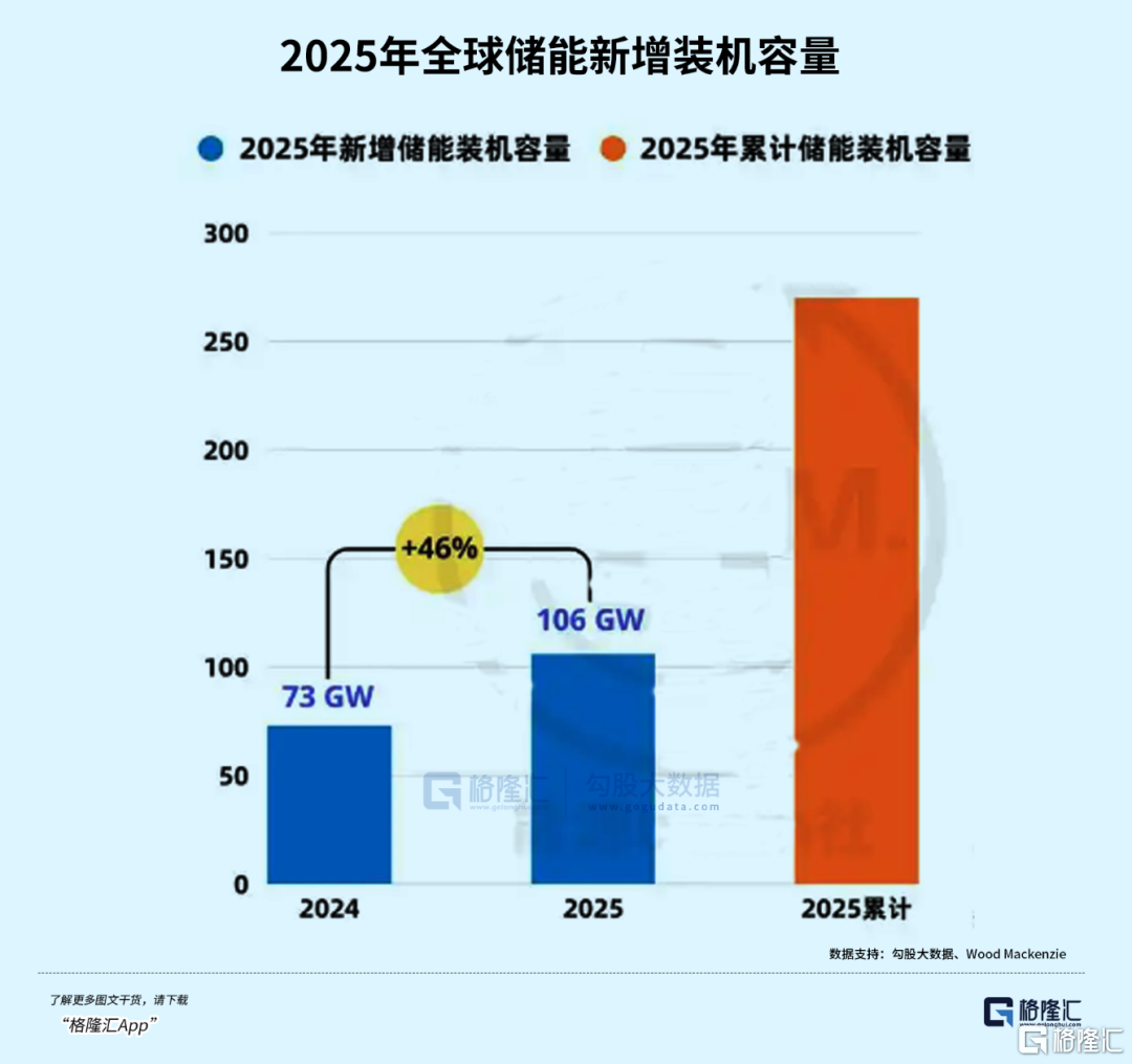 从需求端来看,储能行业正在迎来全球范围的需求共振。根据伍德麦肯兹(Wood Mackenzie)最新数据,2025年全球储能新增装机容量达到106GW,同比增长46%,首次突破100GW关口,全球累计储能装机规模接近270GW/630GWh。在全球能源转型的大背景下,这不仅是一次量级突破,更是储能行业进入新阶段的信号。