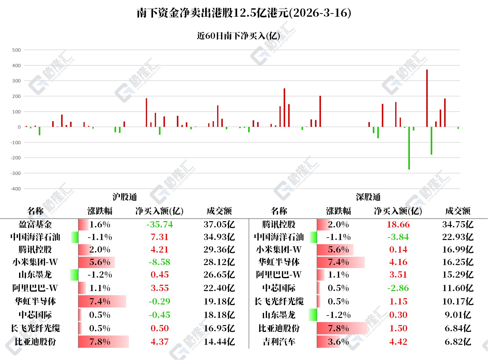 格隆汇3月16日|南下资金今日净卖出港股12.5亿港元。其中: