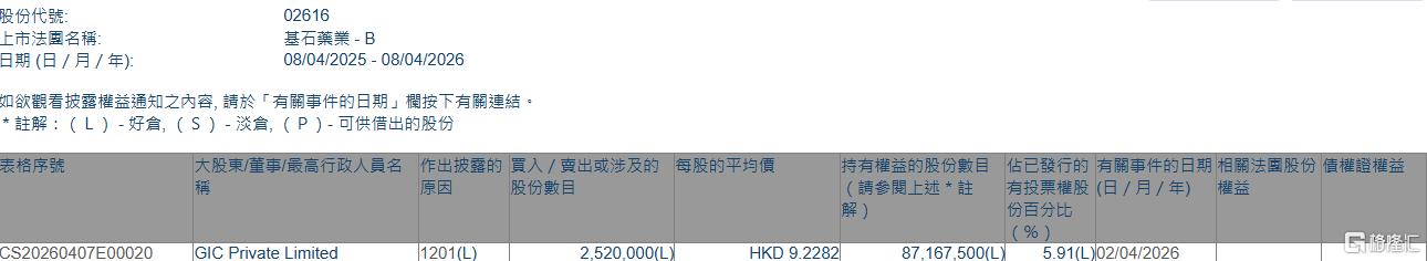 格隆汇4月8日丨根据联交所最新权益披露资料显示,2026年4月2日,基石药业-B(02616.HK)遭GIC Private Limited在场内以每股均价9.2282港元减持252万股,涉资约2325.51万港元。