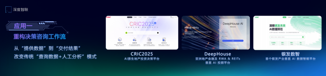 正是基于深度智联在地产垂直领域的专业能力,首批推出了三大产品系列:除了克而瑞·好房点评网,还包括2025年CRIC决策咨询系统、数字员工。