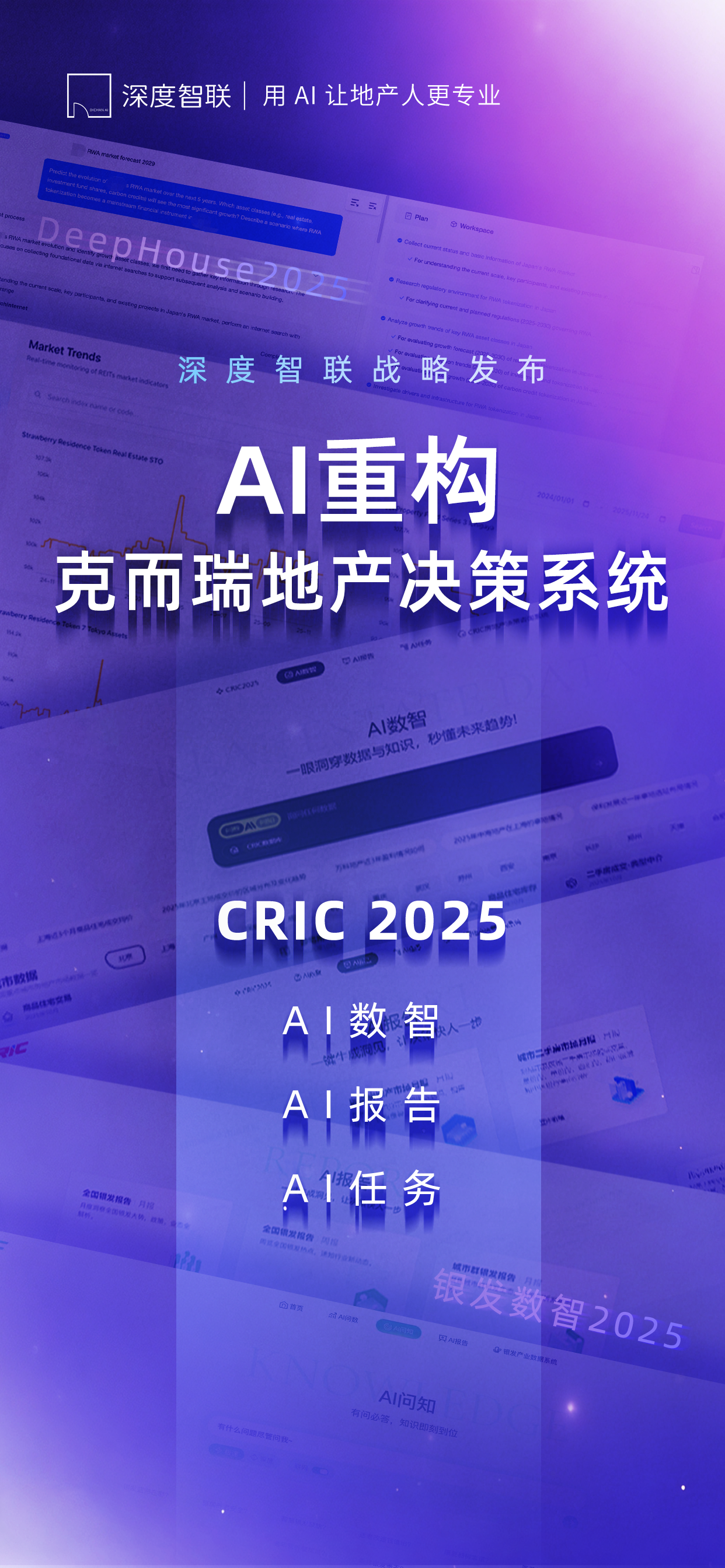 作为深度智联“AI专属空间”推出的首款专业产品,中国房地产决策系统CRIC2025以“AI数智”、“AI报告”和“AI任务”三大模块为核心,基于深度智联的专属数据库、知识库、专家库和工程力库,构建起覆盖“数据-知识-报告-任务”全链路的AI专属空间,实现了对传统行业工作流的根本性重构。