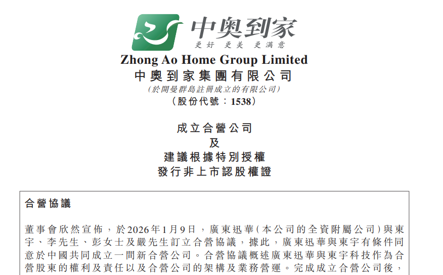 中奥到家表示,成立合营公司有助于集团开拓AI领域的业务发展,通过科技升级创造协同效应。发行认股权证旨在建立绩效导向架构,将合作方利益与公司利益保持一致。