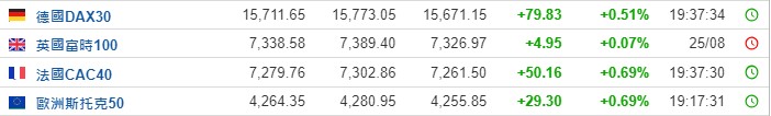 2. 截至发稿,德国DAX指数涨0.51%,英国富时100指数涨0.07%,法国CAC40指数涨0.69%,欧洲斯托克50指数涨0.69%。