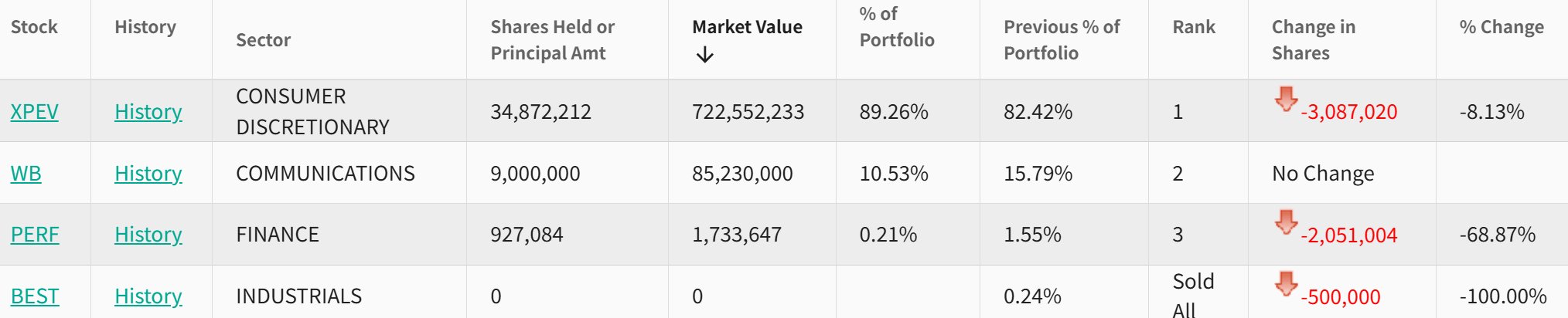 微博(WB.US)位列第二,持仓900万股,持仓市值8523万美元,占投资组合比例为15.79%,持仓数量较上季度无变化。