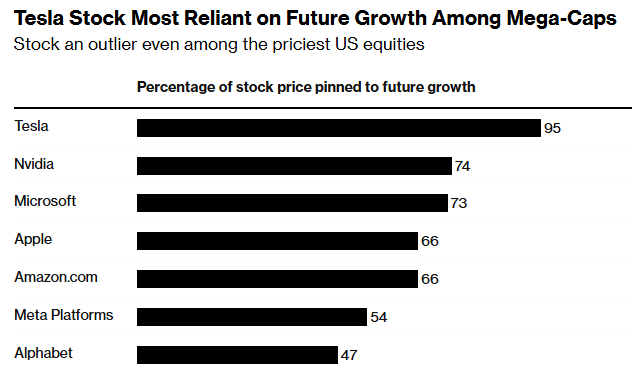 据 DataTrek 公司的Colas计算,特斯拉股票价格的约 95%取决于该公司未来的表现。与所谓的“七大科技巨头”中的其他股票相比,只有英伟达(NVDA.US)和微软(MSFT.US)的这一比例接近,约为 75%。