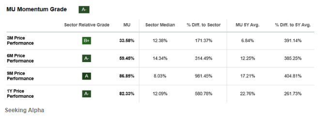 美光科技的股价势头同样强劲,这是财报发布前另一个关键的看涨因素。根据财经平台Seeking Alpha的数据,该股当前的相对强弱指数(RSI)已进入超买区间,股价也显著高于其长期简单移动平均线(SMA)。但考虑到财报发布前存在多项强劲的利好催化剂,这种估值溢价显然具备充分的合理性。