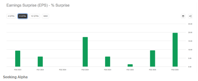 美光科技在财报季极少令市场失望:过去八个季度中,该公司从未出现过每股收益或营收不及预期的情况。最近一个财报季的表现尤为强劲,营收超预期5.4%,每股收益超预期19.8%——对于美光科技这样规模的企业而言,这一成绩堪称亮眼。