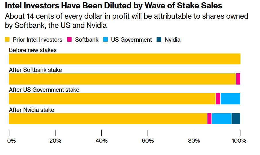 随着英特尔投资者们在一波股权出售中遭遇稀释,每一美元利润中约有14美分将归属于软银、美国政府和英伟达所持股份。
