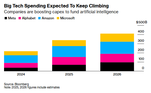 Meta(META.US)、谷歌(GOOGL.US)、亚马逊(AMZN.US)和微软(MSFT.US)计划明年合计投入超4000亿美元用于AI基础设施建设,较2025年增长21%,以抢占新兴技术领域的领先地位。