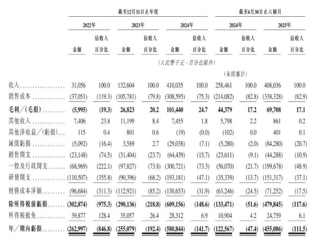 然而,与高增长形成尖锐对比的,是同样令人咋舌的亏损。期内,公司分别亏损2.63亿元、2.55亿元、5.81亿元及4.55亿元。2024年亏损额却同比扩大了近128%。这种“增收不增利”甚至“越赚越亏”的现象,揭示了公司目前所处的阶段:仍处于需要巨额投入以换取市场地位和未来规模的“军备竞赛”期。