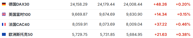 2. 截至发稿,德国DAX指数涨0.20%,英国富时100指数涨0.15%,法国CAC40指数涨0.46%,欧洲斯托克50指数涨0.38%。
