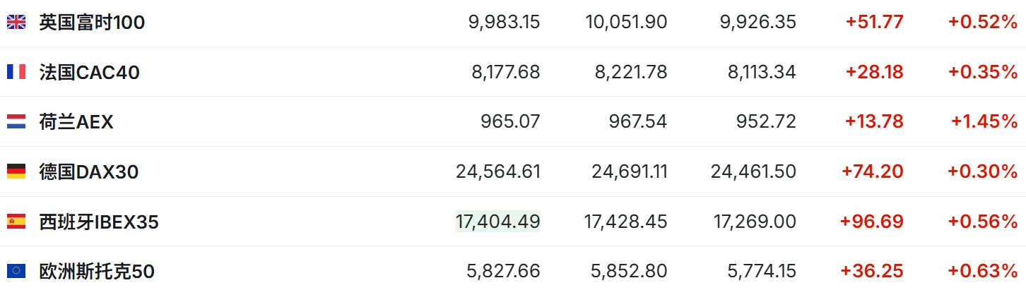 2.截至发稿,德国DAX指数涨0.30%,英国富时100指数涨0.52%,法国CAC40指数涨0.35%,欧洲斯托克50指数涨0.63%。