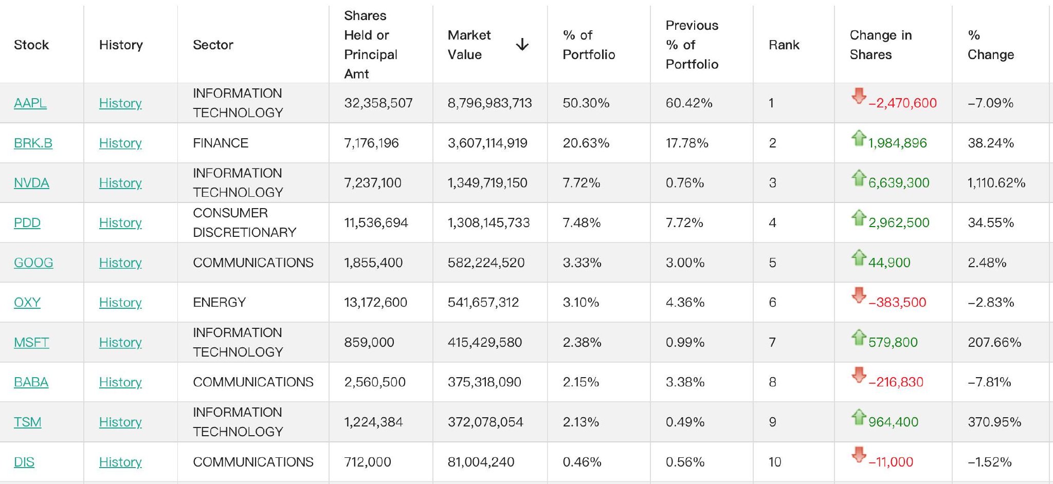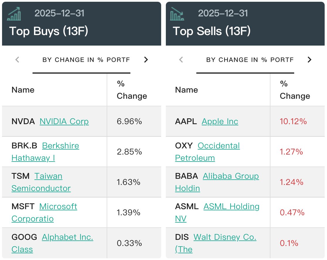 前五大卖出标的分别是:苹果、西方石油(OXY.US)、阿里巴巴(BABA.US)、阿斯麦、迪士尼(DIS.US)。