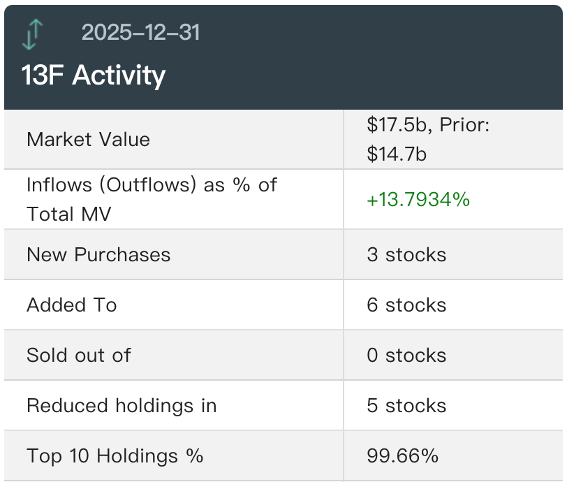 在其他持仓方面,H&H于第四季度大幅增持微软(MSFT.US)及台积电(TSM.US),持仓数量分别较上季度增加207.66%和370.95%。H&H大幅减持了阿斯麦(ASML.US),持仓数量较上季度减少了87.62%。此外,H&H还建仓了云端AI算力租赁领军者CoreWeave(CRWV.US)、数据中心互联解决方案领导者Credo Technology(CRDO.US)、AI辅助精准医疗公司Tempus AI(TEM.US)。