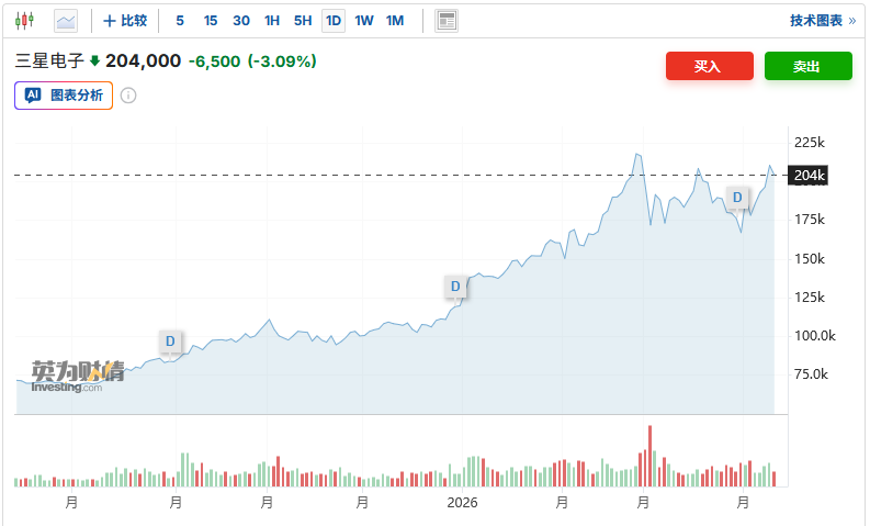 截至发稿,三星电子在韩国上市的股票跌逾3%。
