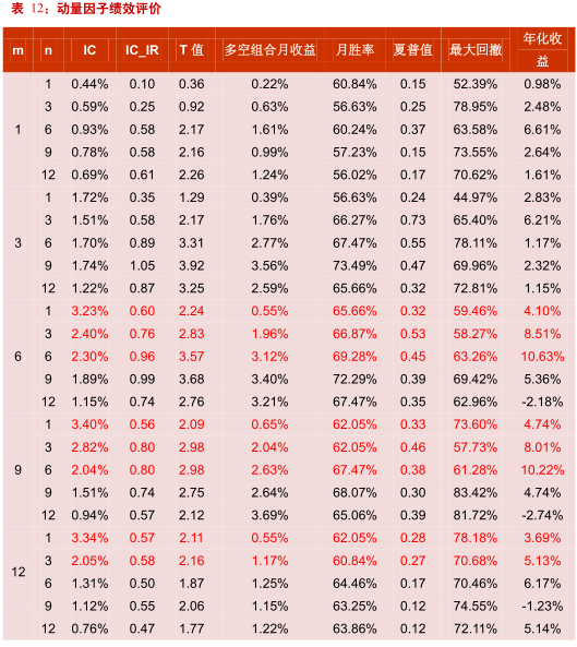 在绩效检验前我们对原始因子按顺序进行如下处理:1.Boxplot方法去极值;2.均值方差标准化;最后得到zscore。我们将不同持有期的动量组合IC除以进行统一。