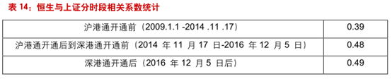 为了考察沪港通与深港通开通对港股和A股市场相关性的影响,我们分别计算了三个阶段的恒生指数与上证指数的相关系数。可以看出,2014年11月沪港通开通使得香港与中国内地市场联动性更为紧密。但2016年12月深港通开通后对两地相关性的提高不明显。