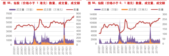 仙股流动性极低:虽然存在暴跌以及暴涨的可能性,但仙股的流动性更是我们需要关注的问题。我们分别统计了从2002.1.2-2017.12.31每日收盘价小于1港元以及小于0.1港元的股票的占比,以及这部分当天的成交量与成交金额。总的来看,香港市场中仙股的数量不断上升。。价格小于1港元的仙股的日均成交量为1041万股,日均成交金额仅为334万港元。价格小于0.1港元的仙股的日均成交量为1737万股,日均成交金额仅为371万港元。整体看,仙股流动性都很差。
