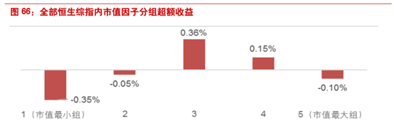 从剔除小票后恒生综指内市值因子的绩效表现来看,IC下降为2.96%,IR仅为0.67。由此可见市值效应主要存在于市值极小的股票中,在剔除极小票后,市值效应并不十分明显。